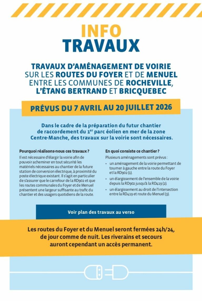 Dans le cadre de la préparation du futur chantier de raccordement du premier parc éolien en mer de la zone Centre-Manche, des travaux de voirie sont nécessaires. Prévus du 07 avril au 20 juillet 2026 Sur les routes du Foyer…