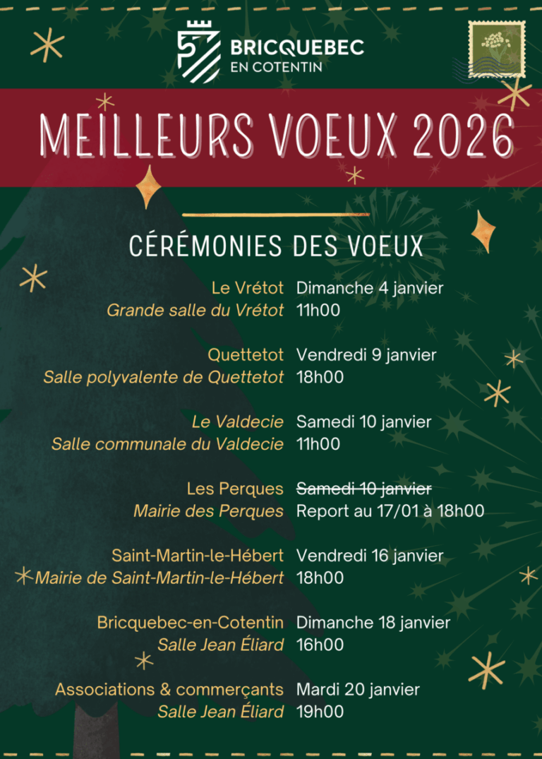 M. le Maire de la ville de Bricquebec-en-Cotentin et l’ensemble du conseil municipal vous souhaitent de bonnes fêtes de fin d’année et auront le plaisir de vous retrouver lors des cérémonies des vœux tout au long du mois de Janvier.