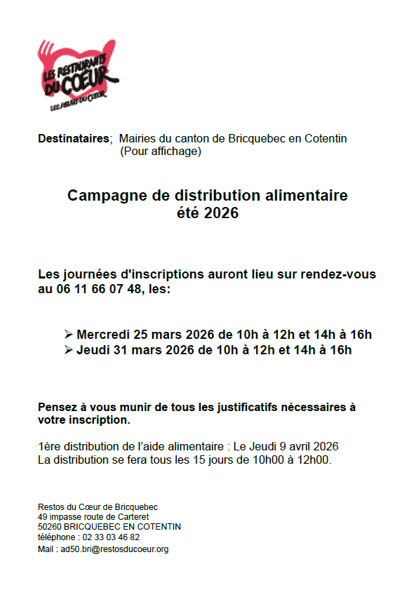 INSCRIPTIONS SCOLAIRES RENTRÉE 2026-2027 Le bulletin d’inscription pour la rentrée prochaine est actuellement disponible. N’hésitez pas à le demander : – par mail marielle.ollivier@bricquebec.fr – à l’accueil de la mairie – sur le site en cliquant ici Retrouvez la présentation…