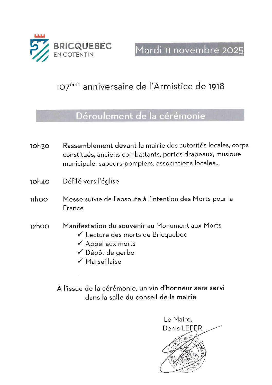 107ème anniversaire de l’Armistice de 1918 Déroulement de la cérémonie : 10h30 : rassemblement devant la mairie des autorités locales, corps constitués, anciens combattants, portes drapeaux, musique municipale, sapeurs-pompiers, associations locales… 10h40 : Défilé vers l’église 11h00 : Messe suivie…