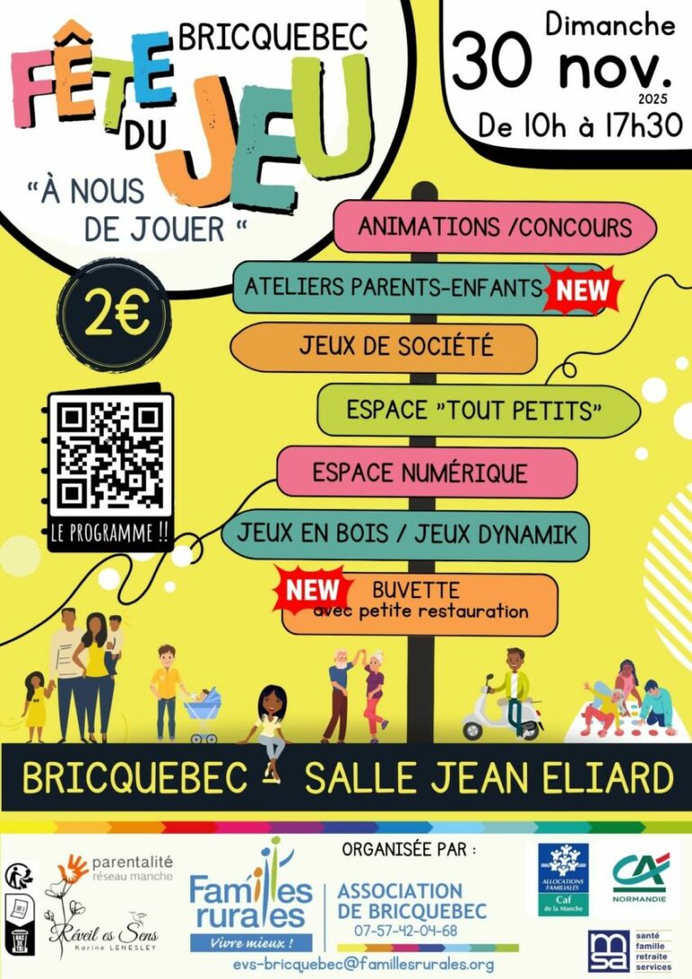 La Fête du Jeu revient ! Préparez-vous pour une journée 100% fun et famille avec Familles Rurales Dimanche 30 novembre de 10h à 17h30 salle Jean Eliard – Bricquebec Des jeux pour tous les âges : Espace tout-petits Grands jeux…