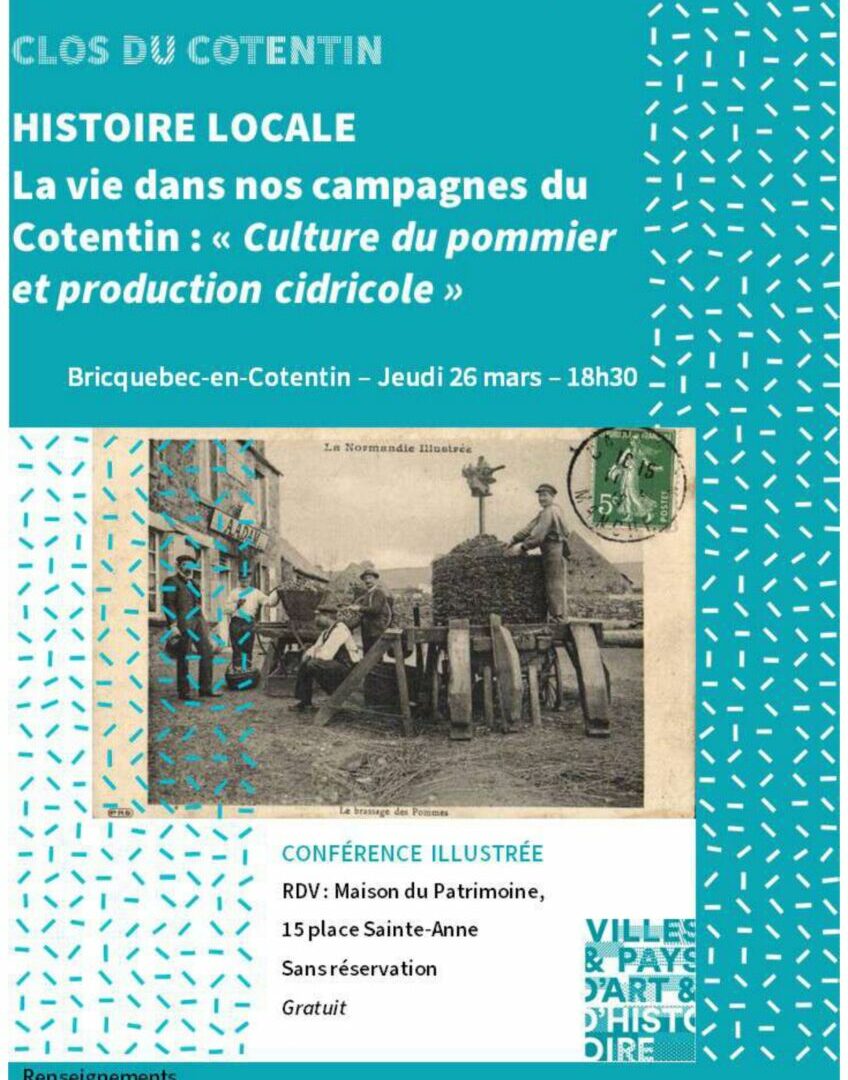 Dans le cadre des causeries consacrées à la vie et aux pratiques agricoles en Cotentin, proposées par le Pays d’art et d’histoire du Clos du Cotentin, sera présentée le jeudi 26 mars, une conférence intitulée « Culture du pommier et production cidricole »